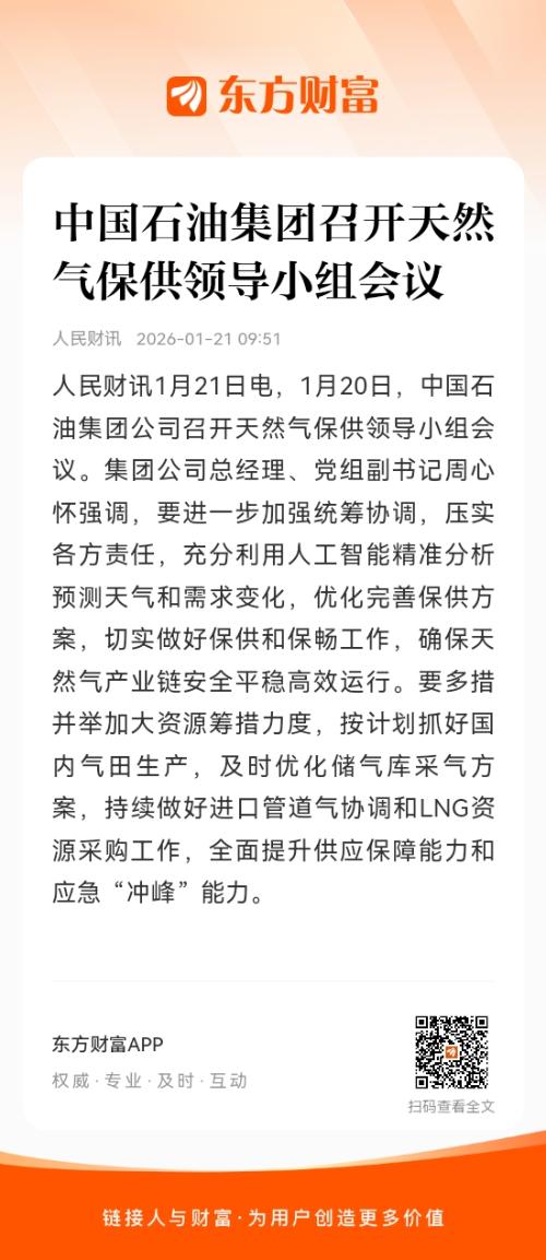 人民财讯1月21日电,1月20日,中国石油集团公司召开天然气保供领导小组会议。集团公司总经理、党组副书记周心怀强调,要进一步加强统筹协调,压实各方责任,充分利用人工智能精准分析预测天气和需求变化,优化完善保供方案,切实做好保供和保畅工作,确保天然气产业链安全平稳高效运行。要多措并举加大资源筹措力度,按计划抓好国内气田生产,及时优化储气库采气方案,持续做好进口管道气协调和LNG资源采购工作,全面提升供应保障能力和应急“冲峰”能力。