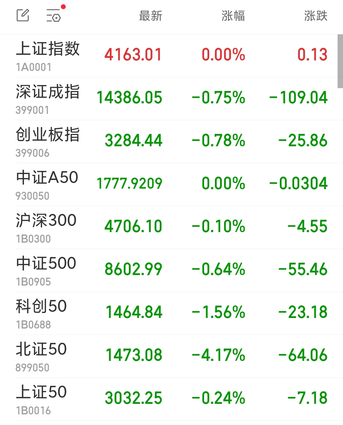 中新经纬3月2日电周一早盘,A股三大指数低开后冲高回落。截至午间收盘,上证指数基本收平,报4163.01点;深证成指跌0.75%,报14386.05点;创业板指跌0.78%,报3284.44点。