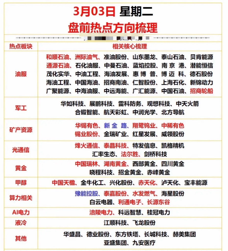 3月03日盘前热点方向梳理盘前热点聚焦油服、黄金、电力及算力板块,个股活跃度提升