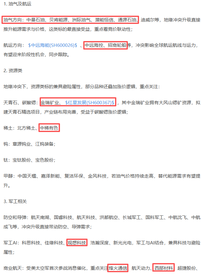油运方向:招商南油、中远海能,国航远洋,受益于冲突带来的航运需求变化,同步跟踪。