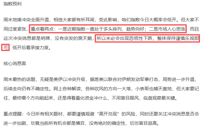 早上就跟大家强调,没必要过度恐慌,果然,指数今日低开高走,完全契合预判!今天一整天的盘面,核心就是围绕地缘冲突发酵展开,说白了就是“信早信”的博弈节点,核心博弈冲突尚未结束,跟着主线走,机会就不会差。
