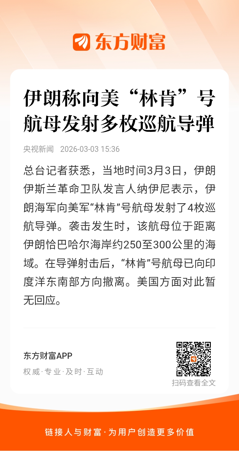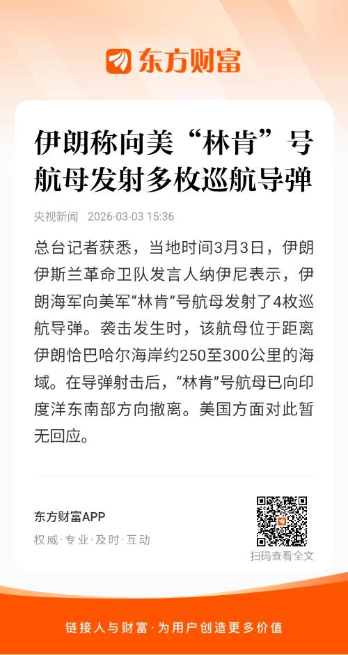 总台记者获悉,当地时间3月3日,伊朗伊斯兰革命卫队发言人纳伊尼表示,伊朗海军向美军“林肯”号航母发射了4枚巡航导弹。袭击发生时,该航母位于距离伊朗恰巴哈尔海岸约250至300公里的海域。在导弹射击后,“林肯”号航母已向印度洋东南部方向撤离。
