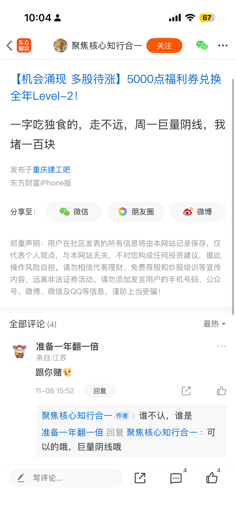 温馨提示: 1.根据《证券法》规定,禁止编造、传播虚假信息或者误导性信息,扰乱证券市场;2.用户在本社区发表的所有资料、言论等仅代表个人观点,与本网站立场无关,不对您构成任何投资建议。用户应基于自己的独立判断,自行决定证券投资并承担相应风险。《东方财富社区管理规定》