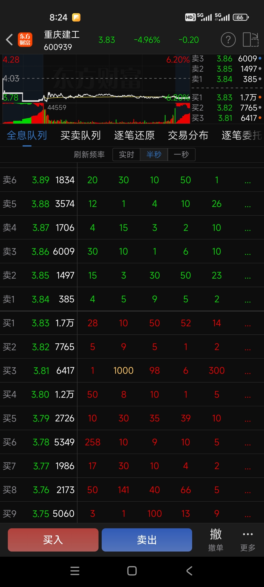 $重庆建工(SH600939)$ 看了一下挂单,卖盘已经没有多少,承接抄底越来越多,卖的基本昨天也都卖出了,今天就是抢筹时候,承接还是抢筹就看主力和柚子了,卖盘已经卖的差不多,下面承接多于卖盘。