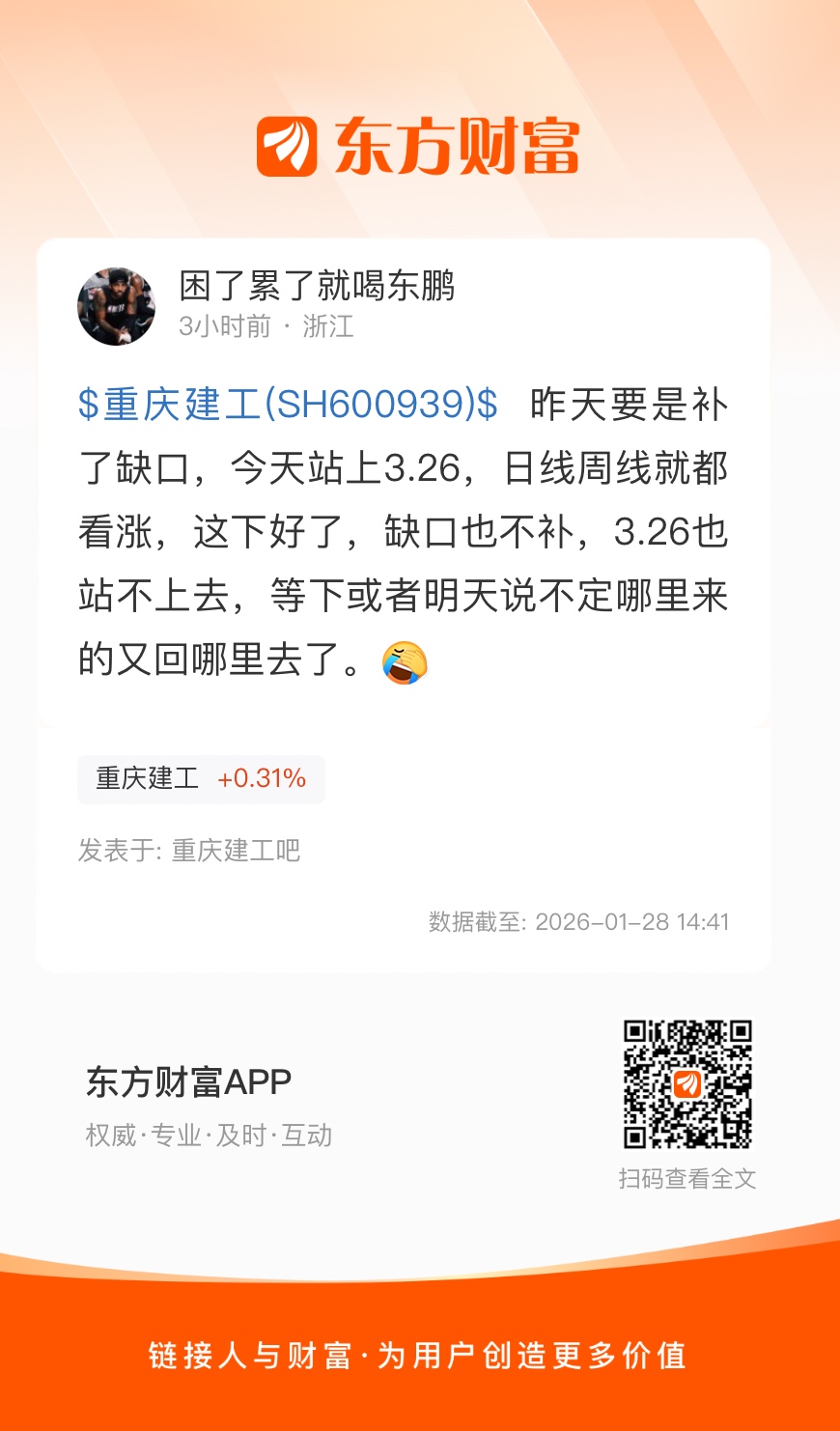 $重庆建工(SH600939)$ 昨天要是补了缺口,今天站上3.26,日线周线就都看涨,这下好了,缺口也不补,3.26也站不上去,等下或者明天说不定哪里来的又回哪里去了。