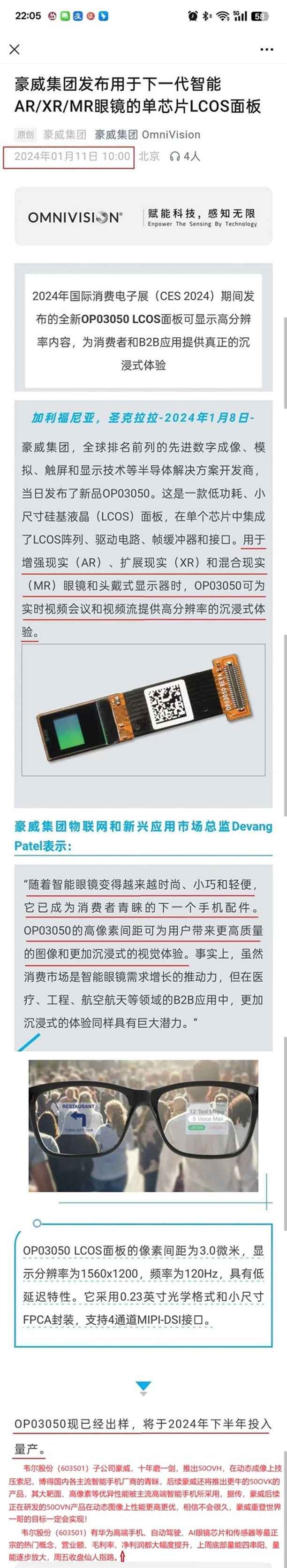 韦尔豪威自建成熟高端芯片封测工厂,降低成本,提升毛利润和竞争力,解决卡脖子问题…… 韦尔股份在低功耗、小尺寸、高分辨率领域具有优势,有望在AI眼镜浪潮中受益。