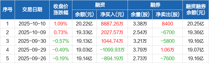 融资方面,当日融资买入2.97亿元,融资偿还2.08亿元,融资净买入8887.26万元,连续3日净买入累计1.2亿元。融券方面,融券卖出1.34万股,融券偿还5000股,融券余量3.38万股,融券余额360.27万元。融资融券余额合计20.25亿元。