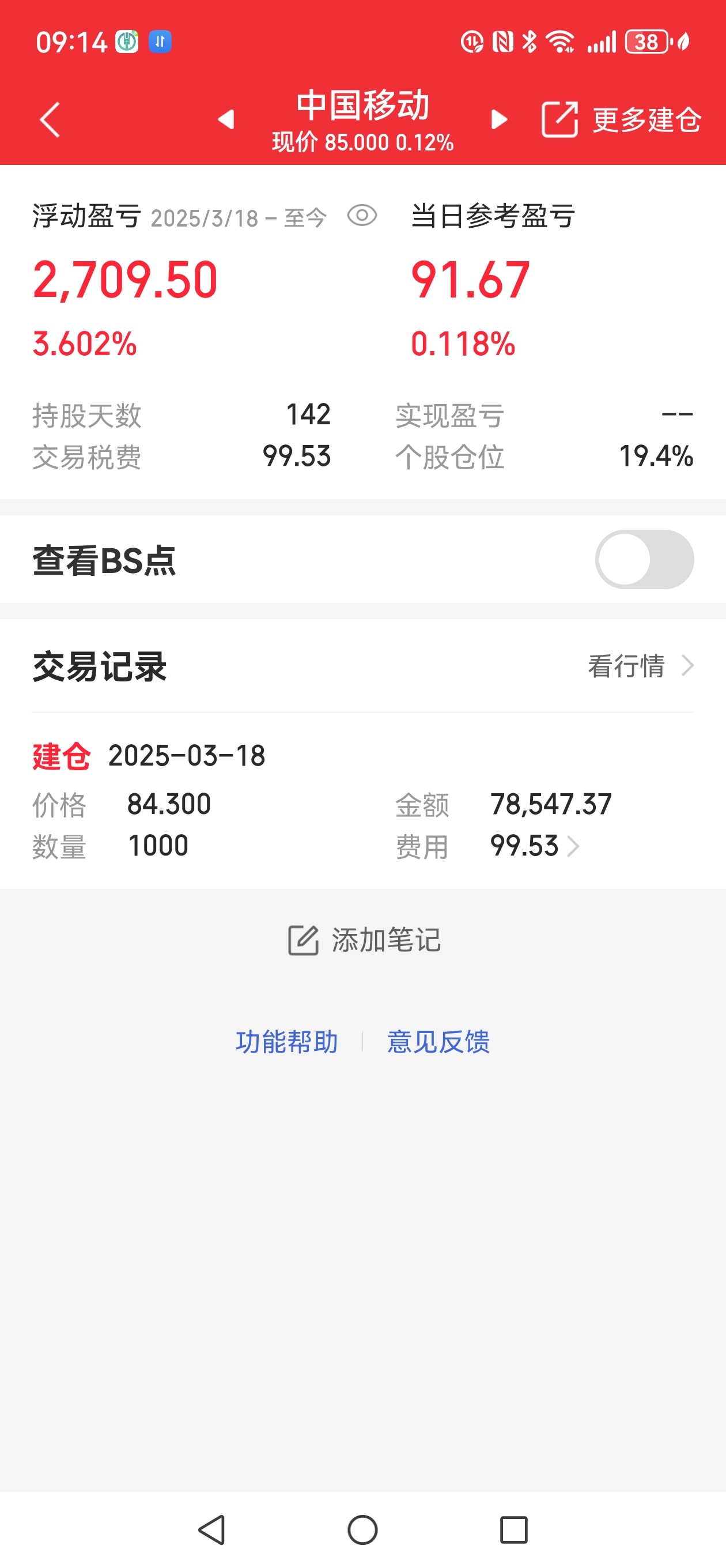 $中国移动(SH600941)$ 我今年3月18日买入中国移动h股2手,目前账户显示盈利3.6个点。我享受了两次分红税后纯收入3437.20元。中国移动H股不温不火,拿着有不错的收入。缺点是没有打新的额度。持股142天每天43元的进账,这可以啊。