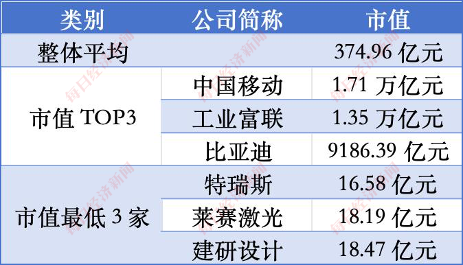 市值方面,659家公司的平均市值为374.96亿元,其中中国移动、工业富联、比亚迪排行TOP3,分别达1.71万亿元、1.35万亿元、9186.39亿元。值得一提的是,市值最低的3家公司中,有两家为北交所上市公司。