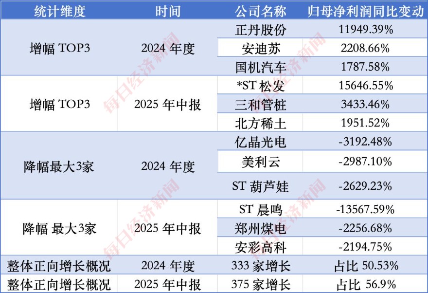 根据2025年中报数据,同比增长的公司数量增至375家,占比56.9%,*ST松发以15646.55%的增幅居首,三和管桩、北方稀土增幅分别为3433.46%、1951.52%。