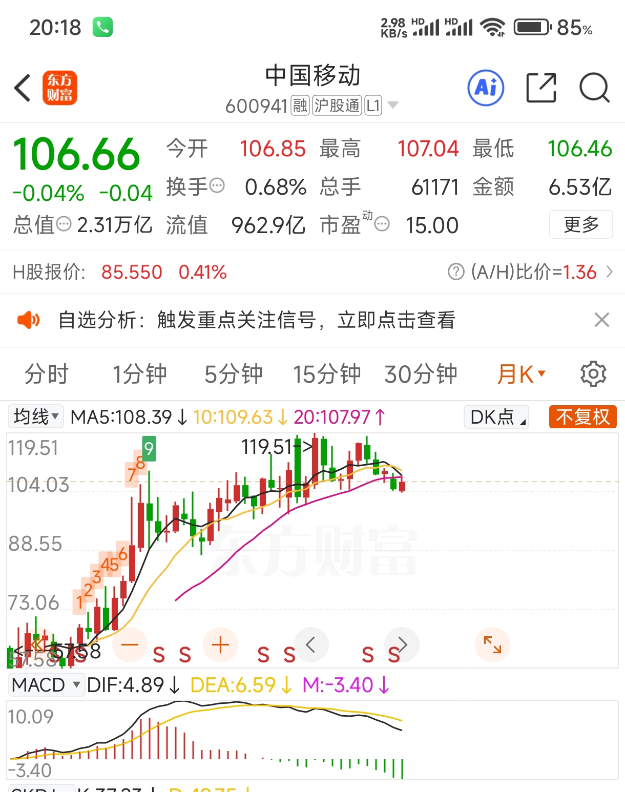 $中国移动(SH600941)$ 月线下坡路开始了,不值得关注了。