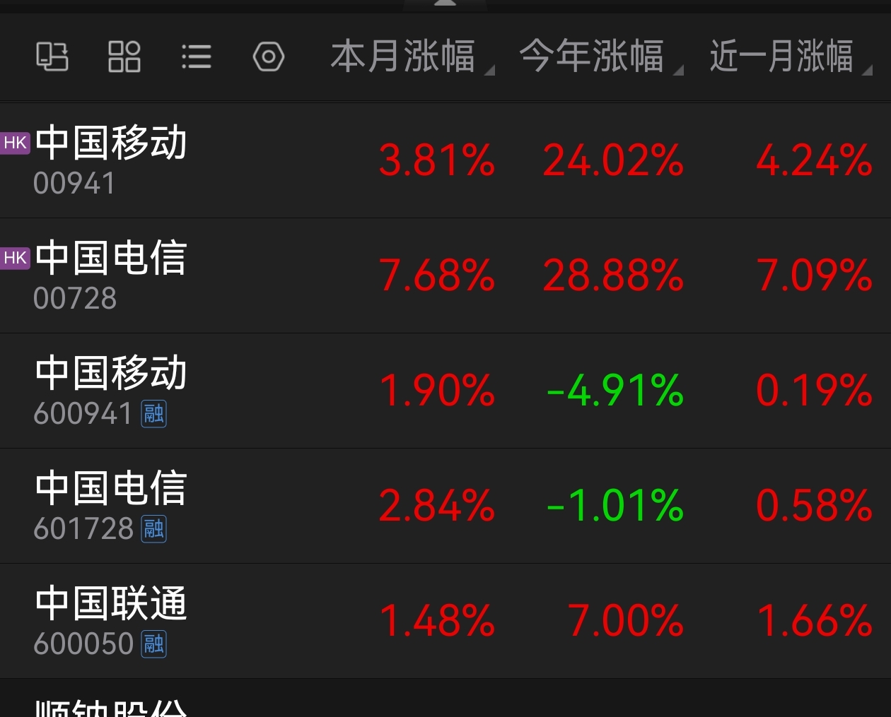 今年电信三兄弟的涨跌幅。
