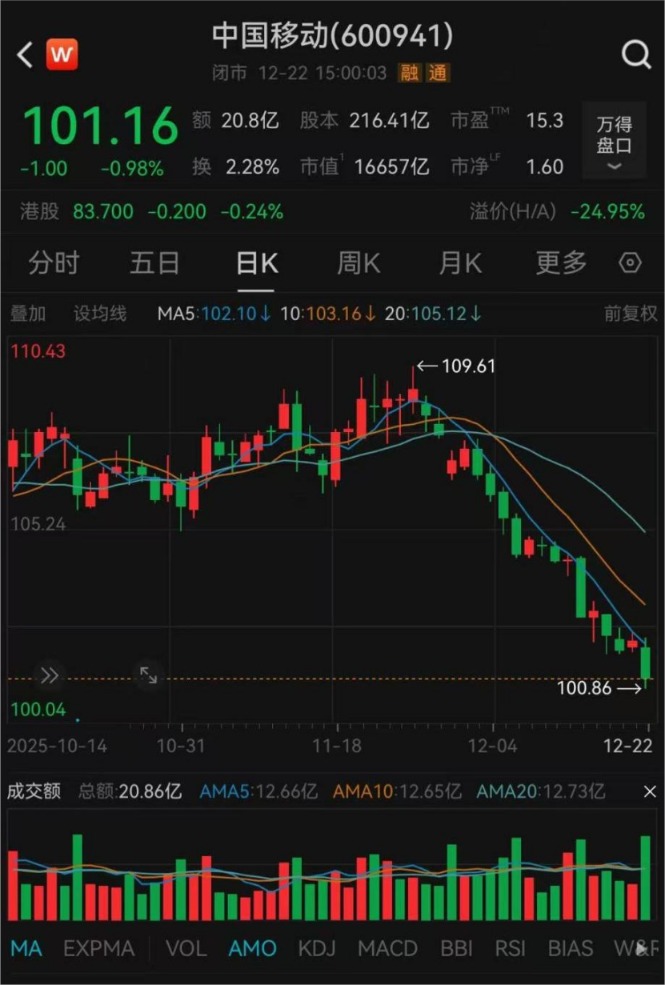 截至12月22日收盘,中国移动A股每股报101.16元,总市值约1.67万亿元。