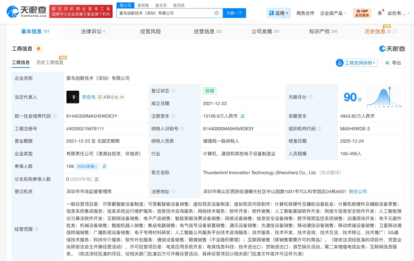 天眼查App显示,近日,雷鸟创新技术(深圳)有限公司发生工商变更,新增北京中移数字新经济产业基金合伙企业(有限合伙)、上海中移数字转型产业私募基金合伙企业(有限合伙)、茅台金石(贵州)生物科技产业基金合伙企业(有限合伙)等为股东,同时,注册资本由约1.17亿人民币增至约1.51亿人民币。雷鸟创新技术(深圳)有限公司成立于2021年12月,法定代表人为李宏伟,经营范围含可穿戴智能设备制造、可穿戴智能设备销售、虚拟现实设备制造、虚拟现实内容制作、计算机软硬件及辅助设备批发、人工智能基础软件开发等,现由李东生、宁波挚诚拓远企业管理合伙企业(有限合伙)、惠州TCL移动通信有限公司及上述新增股东等共同持股。公开信息显示,雷鸟创新是一家专注于AR领域的创业公司,核心团队来自AR、手机和智屏等领域。产品涵盖显示、AI、人机交互等技术领域。