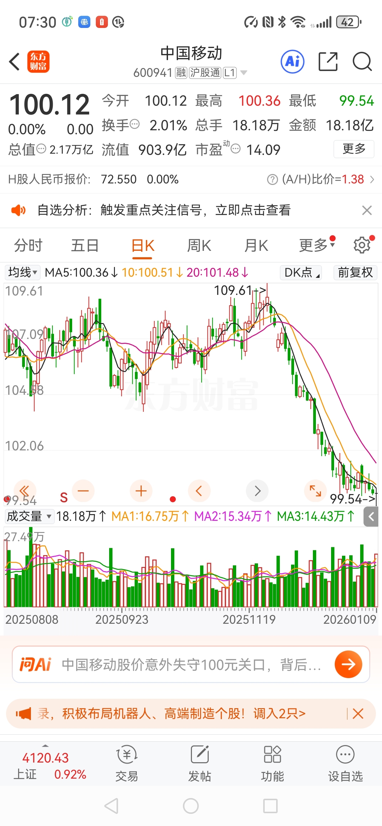 $中国移动(SH600941)$ 上周五沪指登上4100点,中国移动,中国电信还停留在3200点左右,凡是沾上航天航空和宇宙的股票在飞。