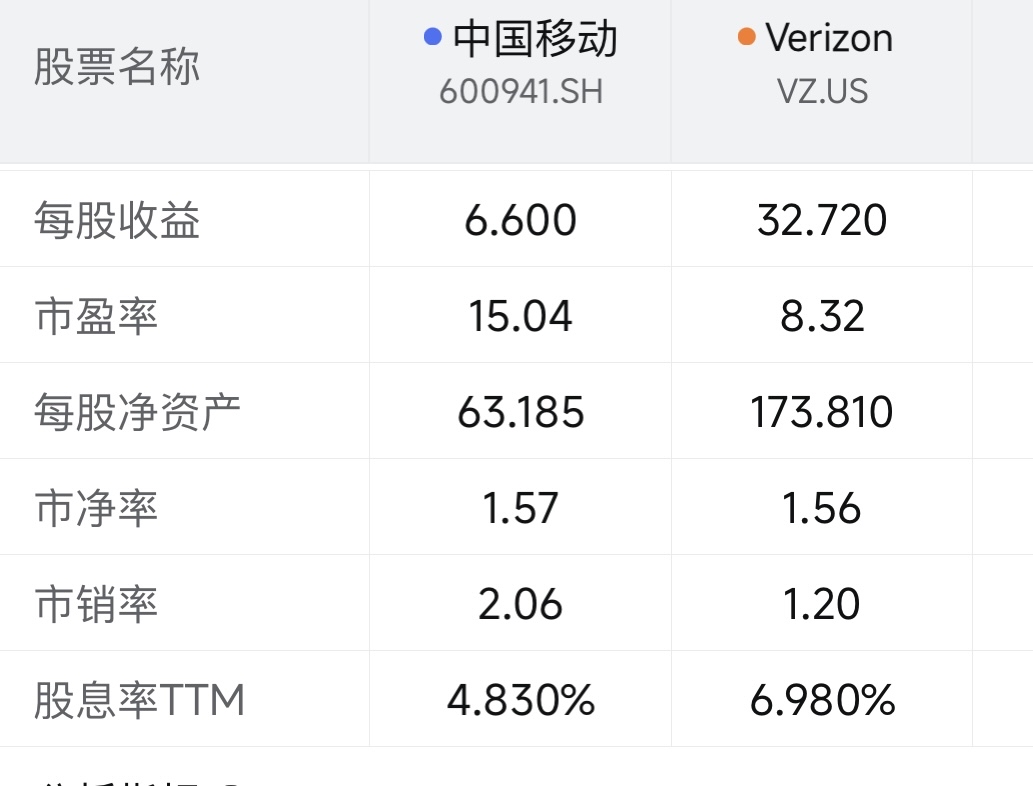 Vz的市盈率从18跌到8,移动会不会也从15跌到10以下呢,
