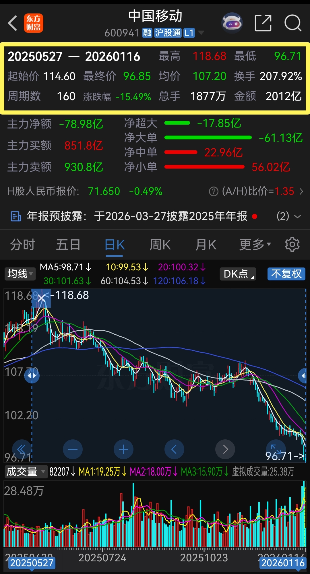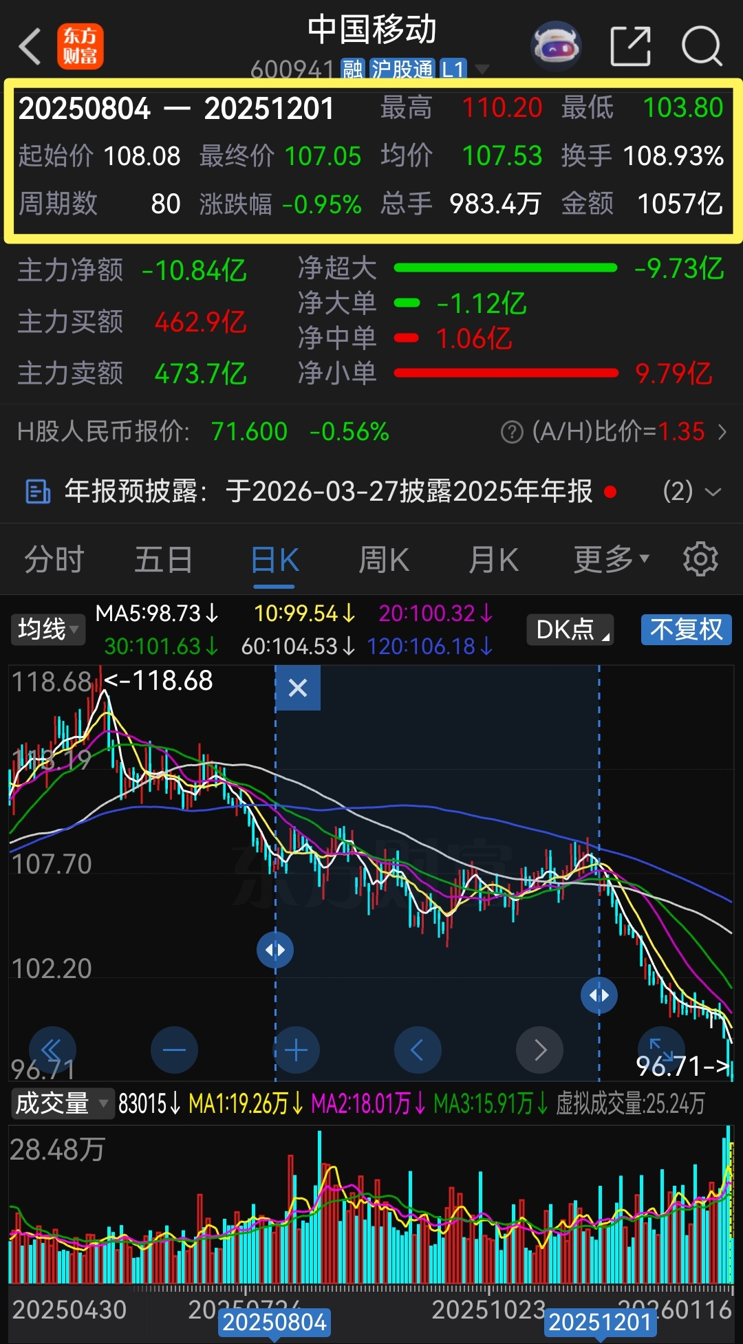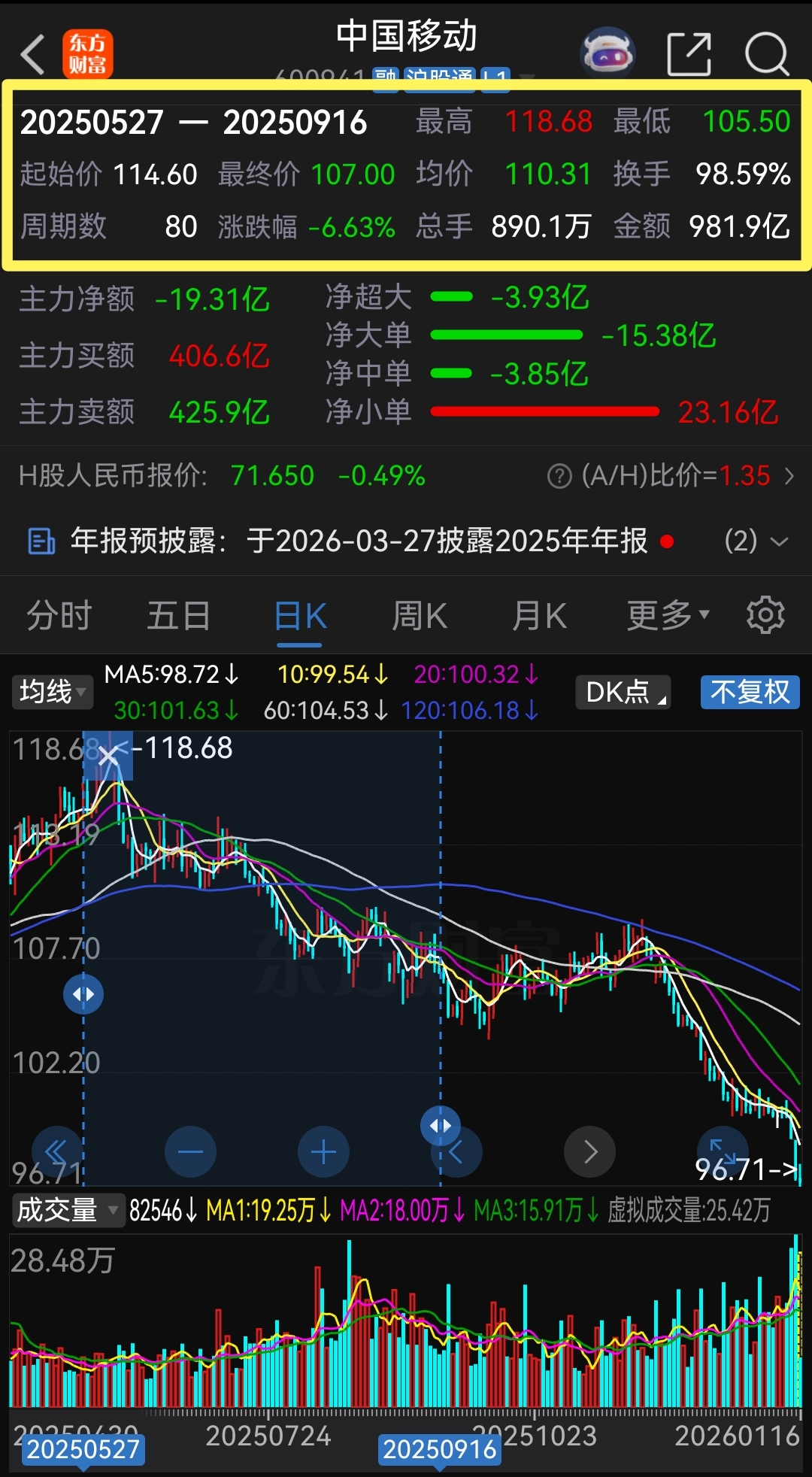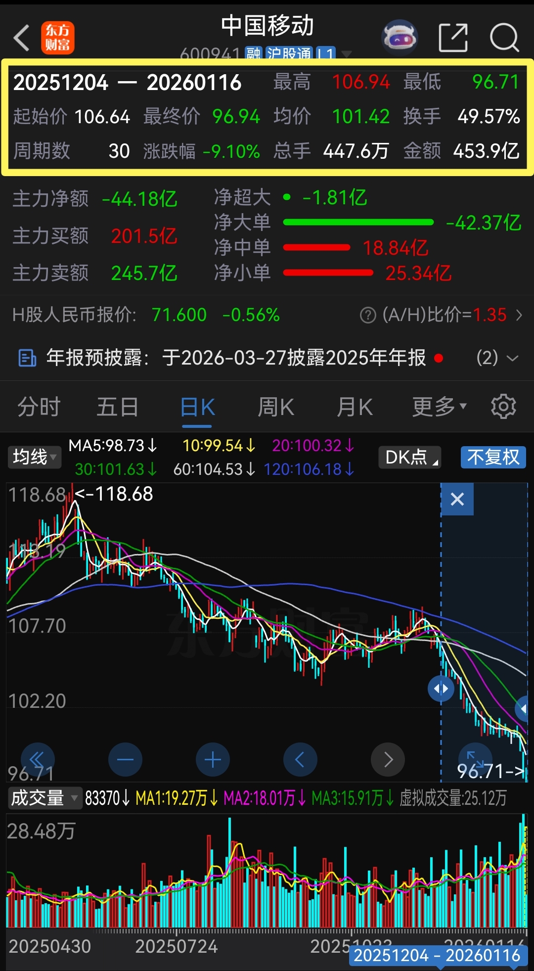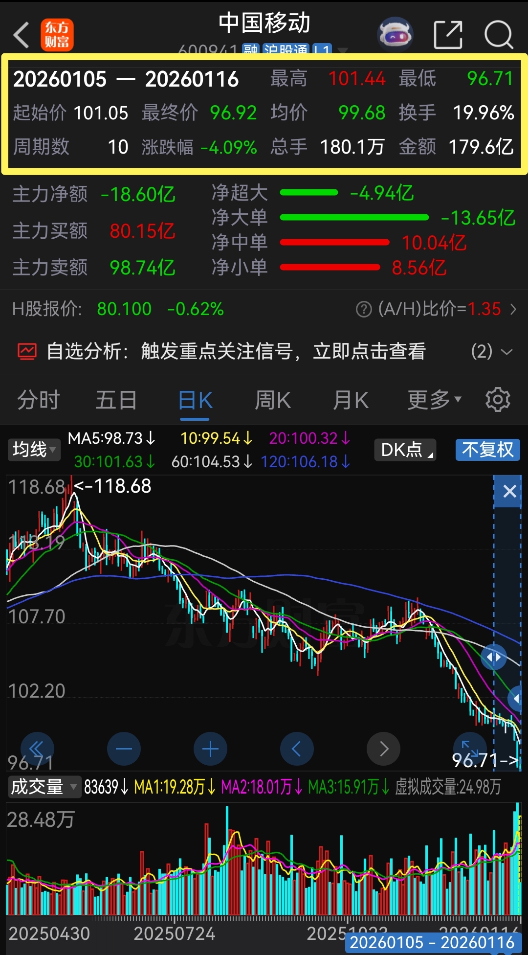 黎明前的黑暗!此刻千万别倒下!中移动今天最低价96.71元击穿BOLL线下轨97