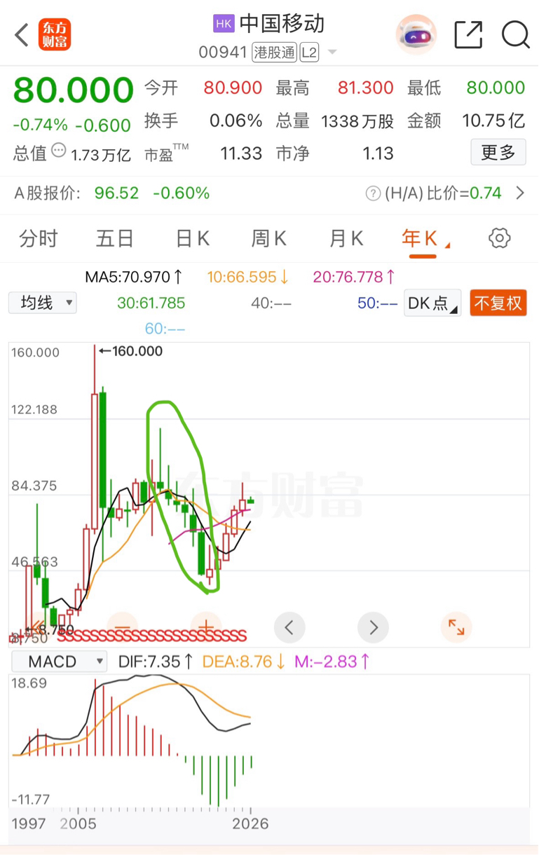 $中国移动(SH600941)$ 港股历史从最高位跌了7年才见底,有什么利空?资本开支增长,单客消费下降而已。