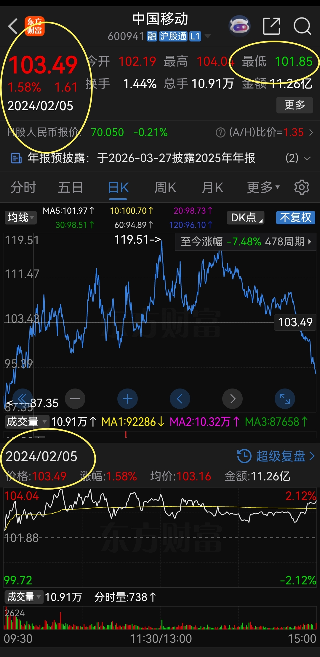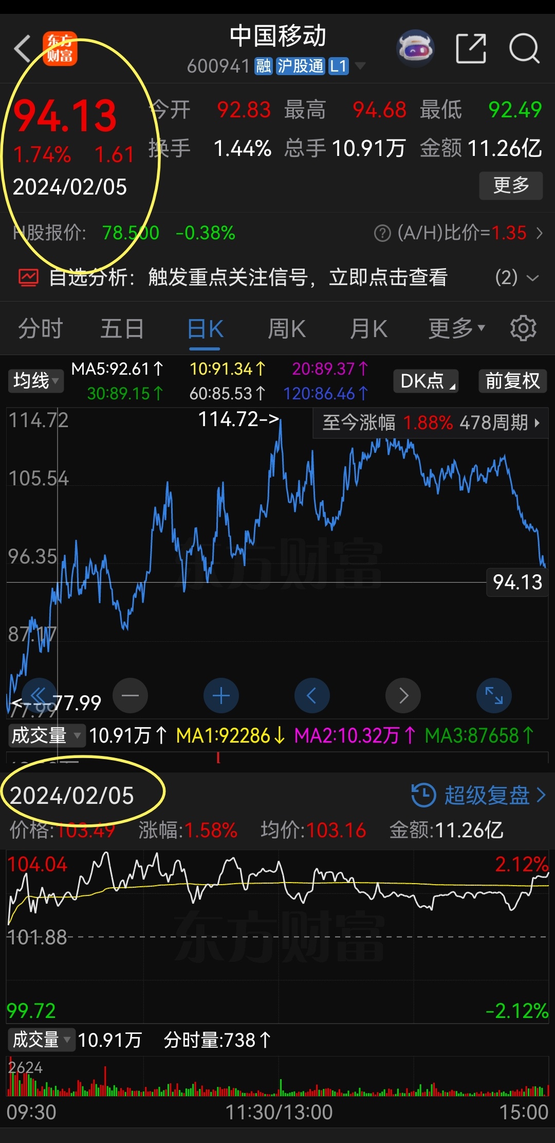 $中国移动(SH600941)$ 中移动复权(后复权)后今天的股价,只比2月5日沪市收盘大盘指数2702点时中移动价当天的股价高0.13元,这只白马奶牛分红老登股真的很牛批啊!真的用于调控指数的利器!
