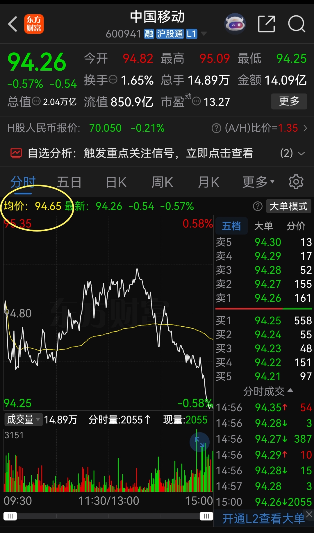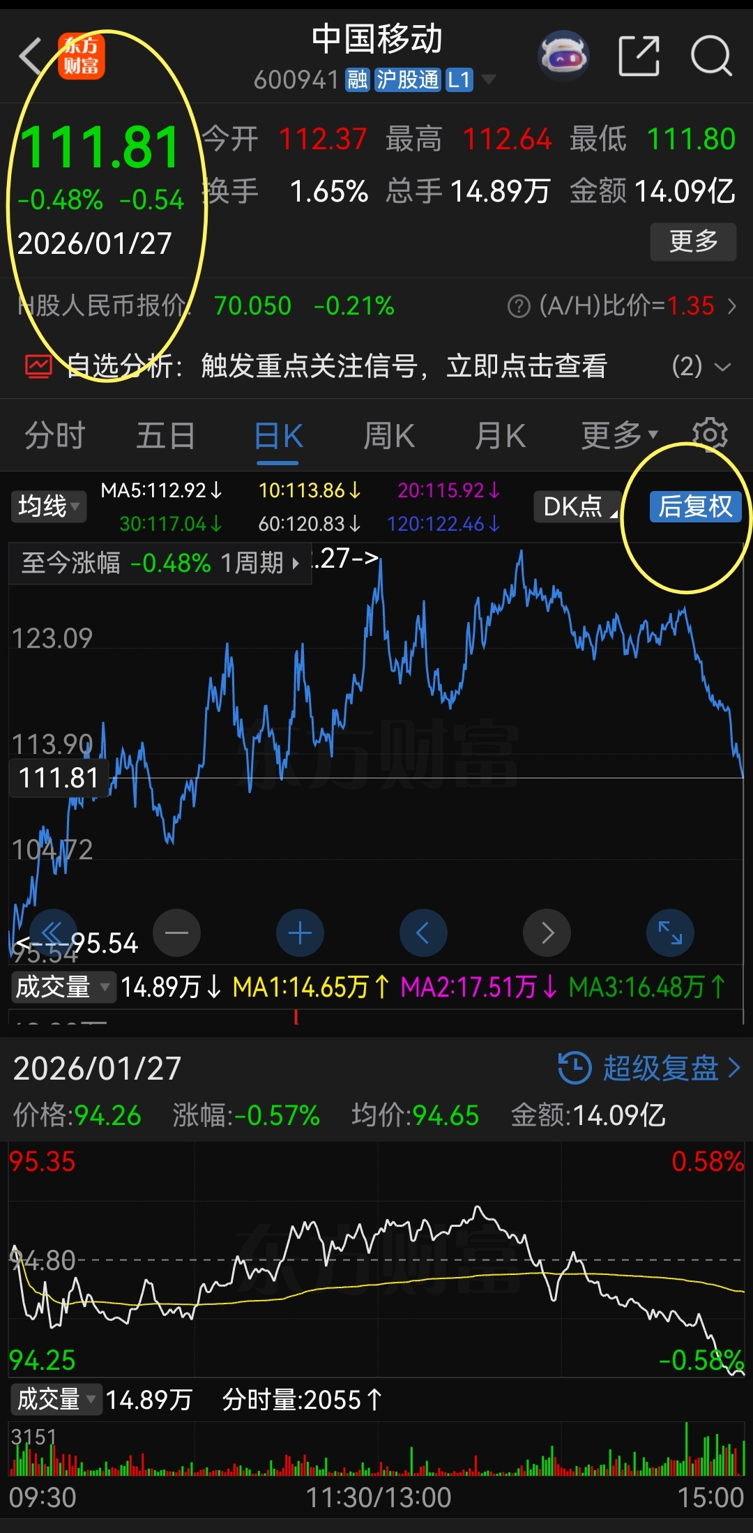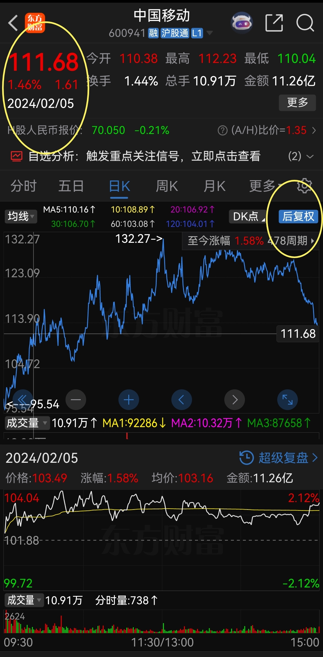中移动复权(后复权)后今天的股价,只比2月5日沪市收盘大盘指数2702点时中移动