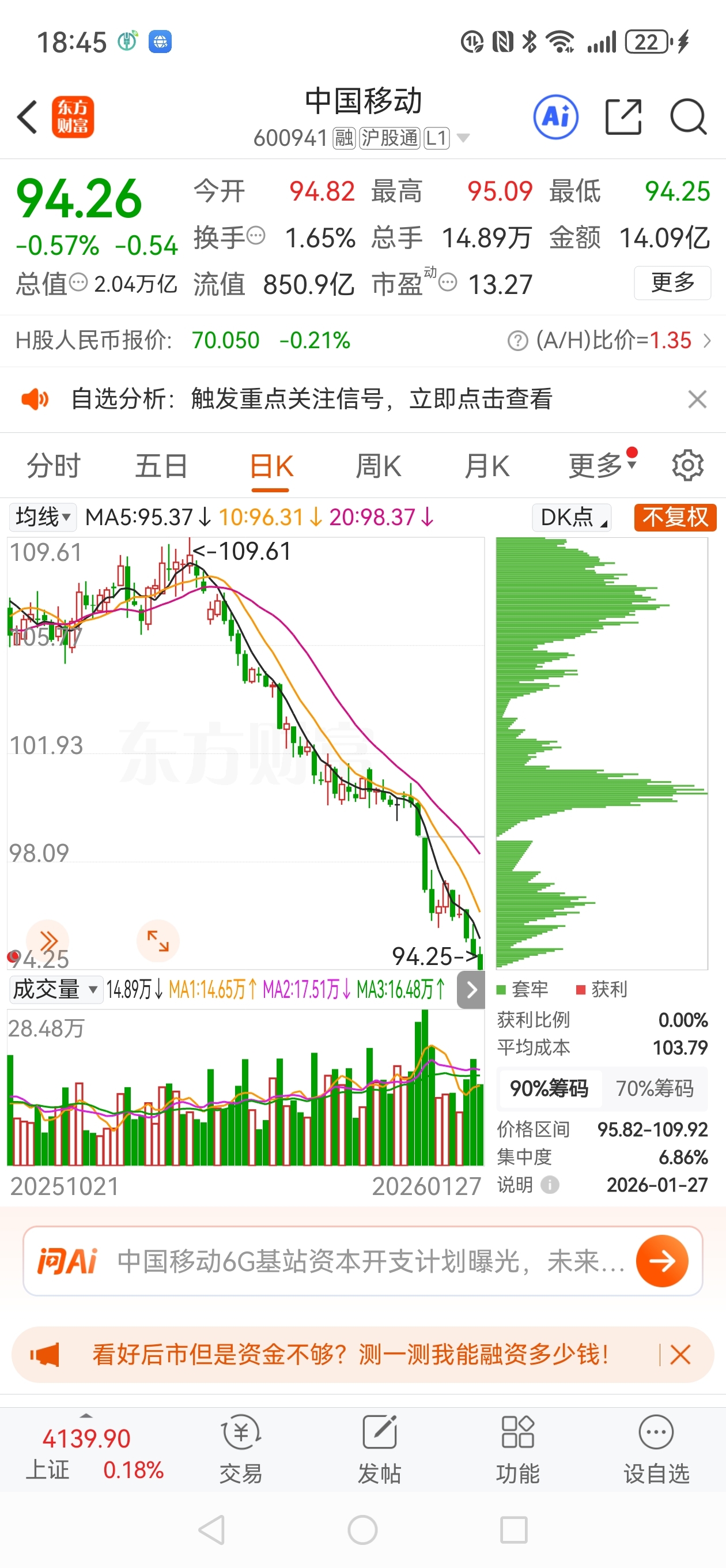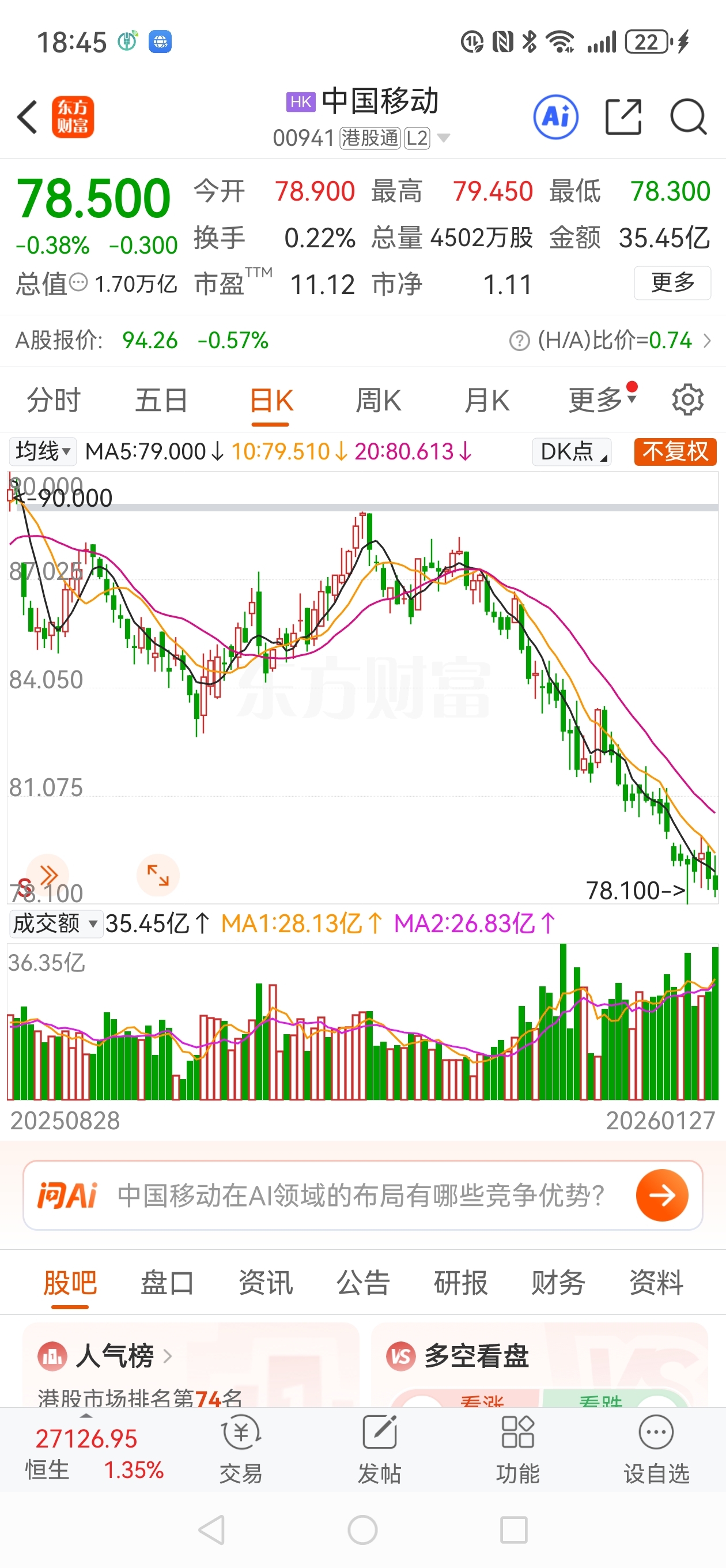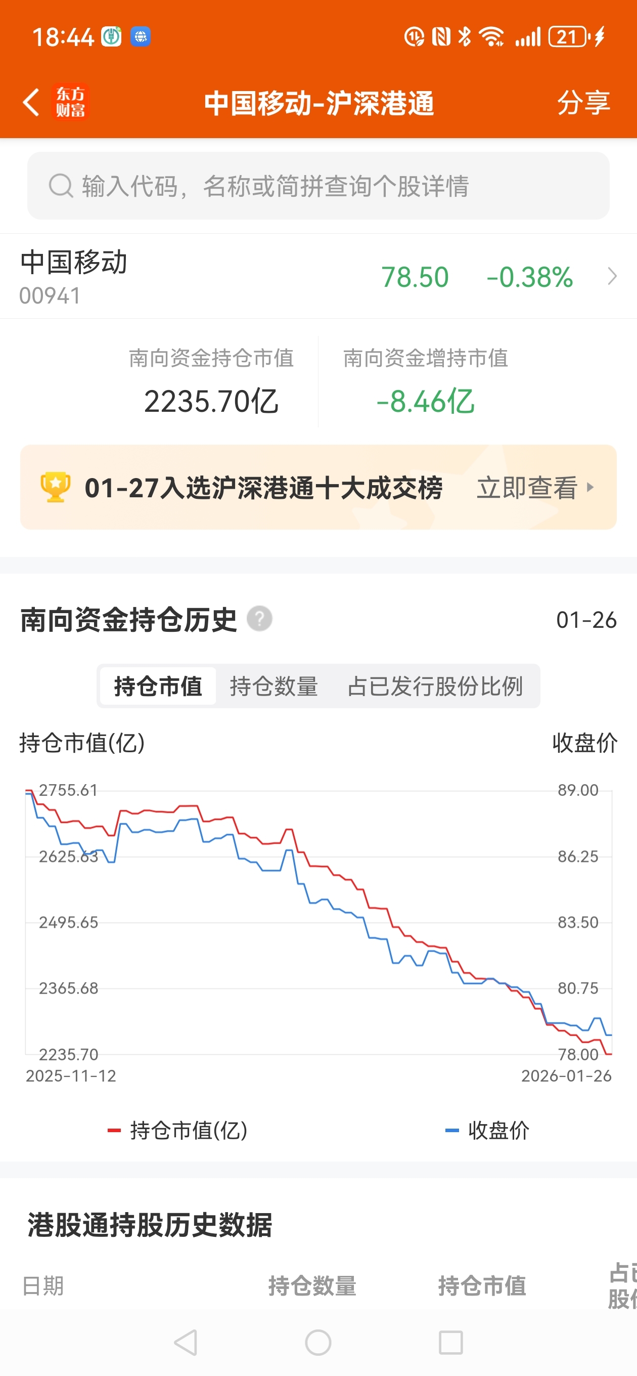 $中国移动(SH600941)$ 中国移动AH股双双飞流直下三千尺。南下资金净卖出移动H股与股价下跌同步,方向出奇的一致。我曾有1000股中国移动h股。第1次88.10钱卖出500股,第2次79.20卖出剩余的500股,账面赚了44块钱,只剩下裤衩了。真的不能跟趋势作对啊。