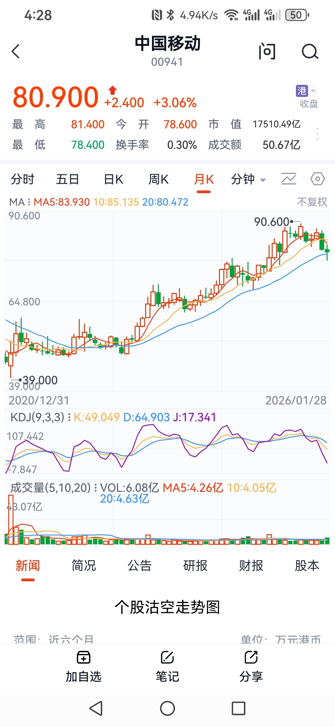 $中国移动(SH600941)$ 看看移动股吧里的帖子,怎么感觉说得话格局太小了吧。不会是玩股都玩成小心眼了。要有牛市格局思维,上涨走势过程中,每次大的回调都是进场或加仓的机会。只是中国移动前几年提前涨的多而已,现在回调很正常,洗出不坚定的筹码。轮动上涨,题材股-成长性股-蓝筹股…,莫要担惊,少要害怕。面包会有的,一切都会有的。港股移动上涨在路上…