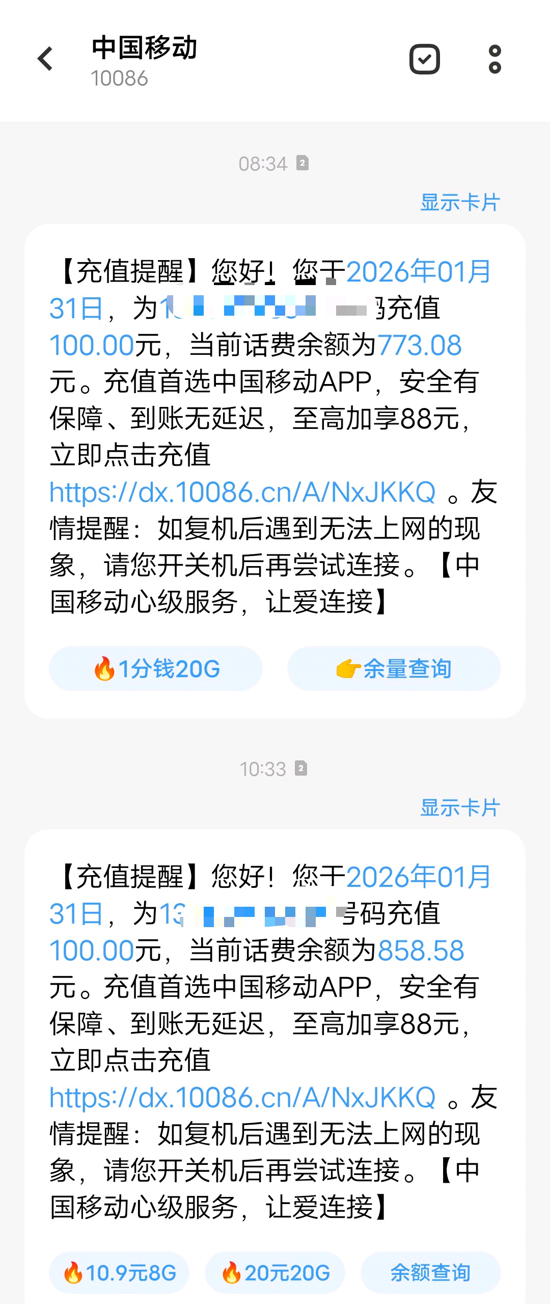 $中国移动(SH600941)$ 1月最后一天,赶紧充200话费,给公司创造点业绩!下个月加油吧!