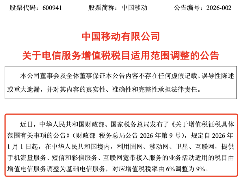 2月1日,中国移动、中国电信、中国联通发布公告称,近日,中华人民共和国财政部、国家税务总局发布了《关于增值税征税具体范围有关事项的公告》(财政部税务总局公告2026年第9号),规定自2026年1月1日起,在中华人民共和国境内,利用固网、移动网、卫星、互联网,提供手机流量服务、短信和彩信服务、互联网宽带接入服务的业务活动适用的税目由增值电信服务调整为基础电信服务,对应增值税税率由6%调整为9%。