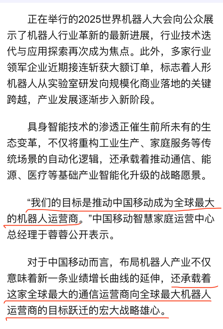 中国移动:全球最大的通信运营商(稳定的基础)+目标成为全球最大的机器人运营商(万