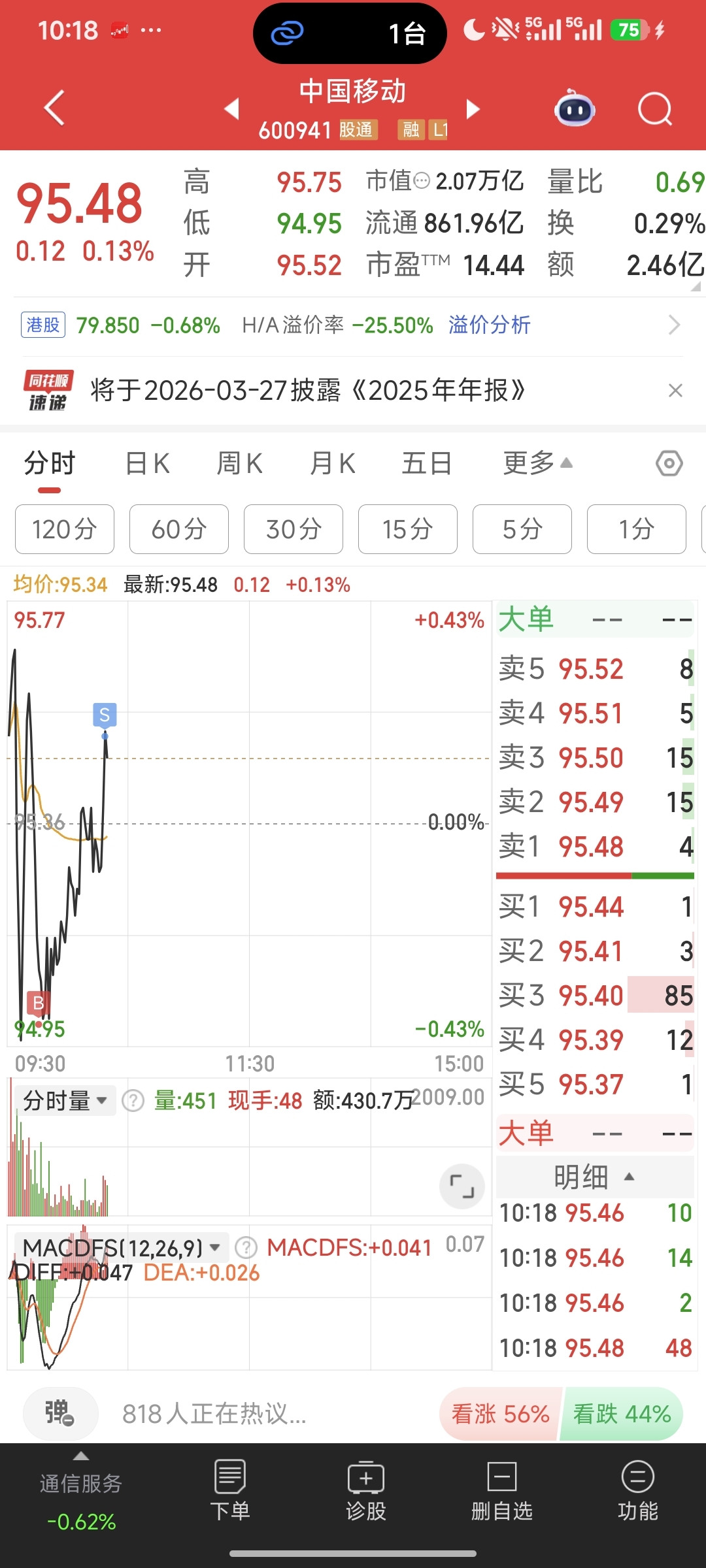 $中国移动(SH600941)$ 横盘我就做T跌下来我也不怕
