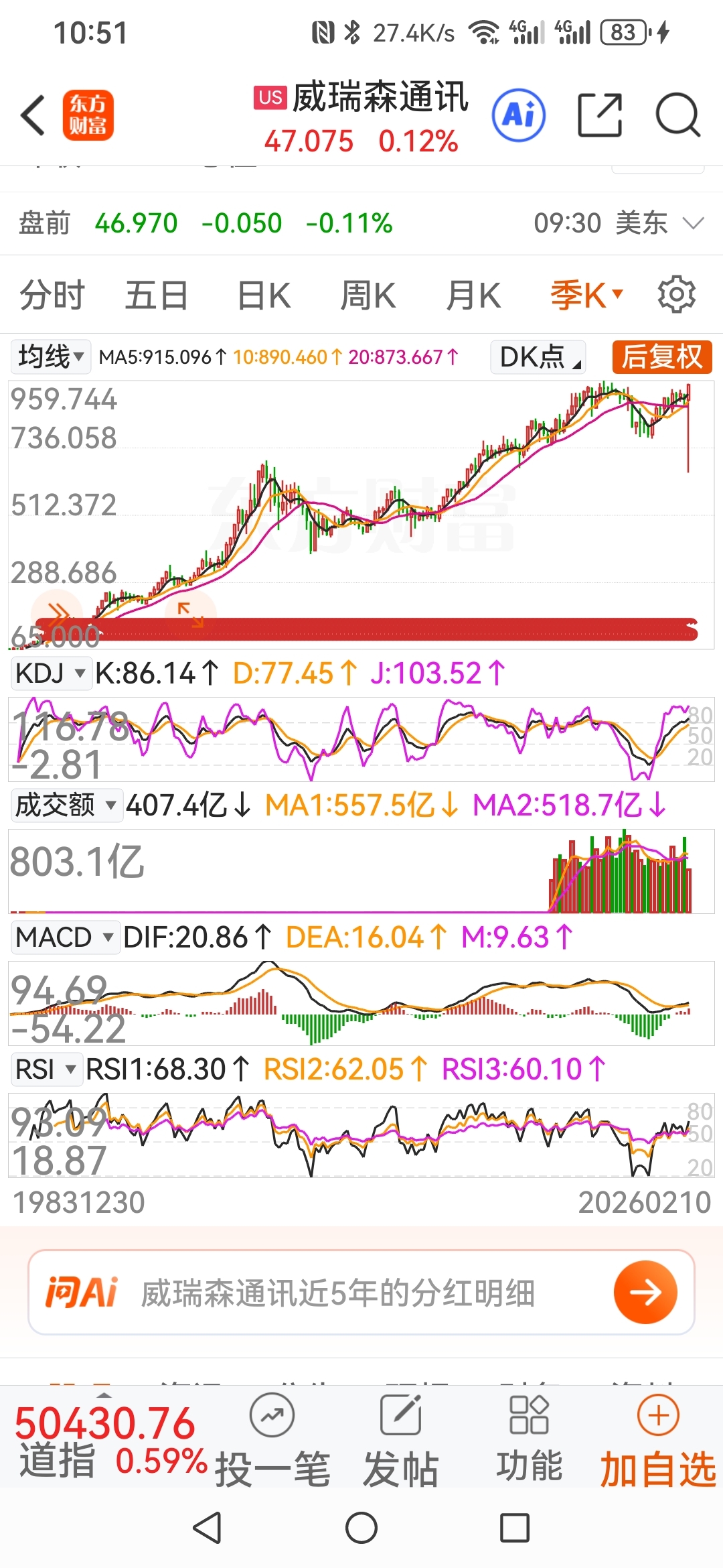 美股的通讯股威瑞森复权后创历史新高。移动遥不可及,我们15亿人口,它们才3.45