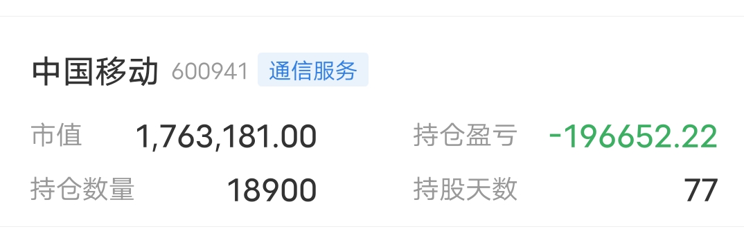 $中国移动(SH600941)$ 108.31买到现在成本还104,唉,亏20万