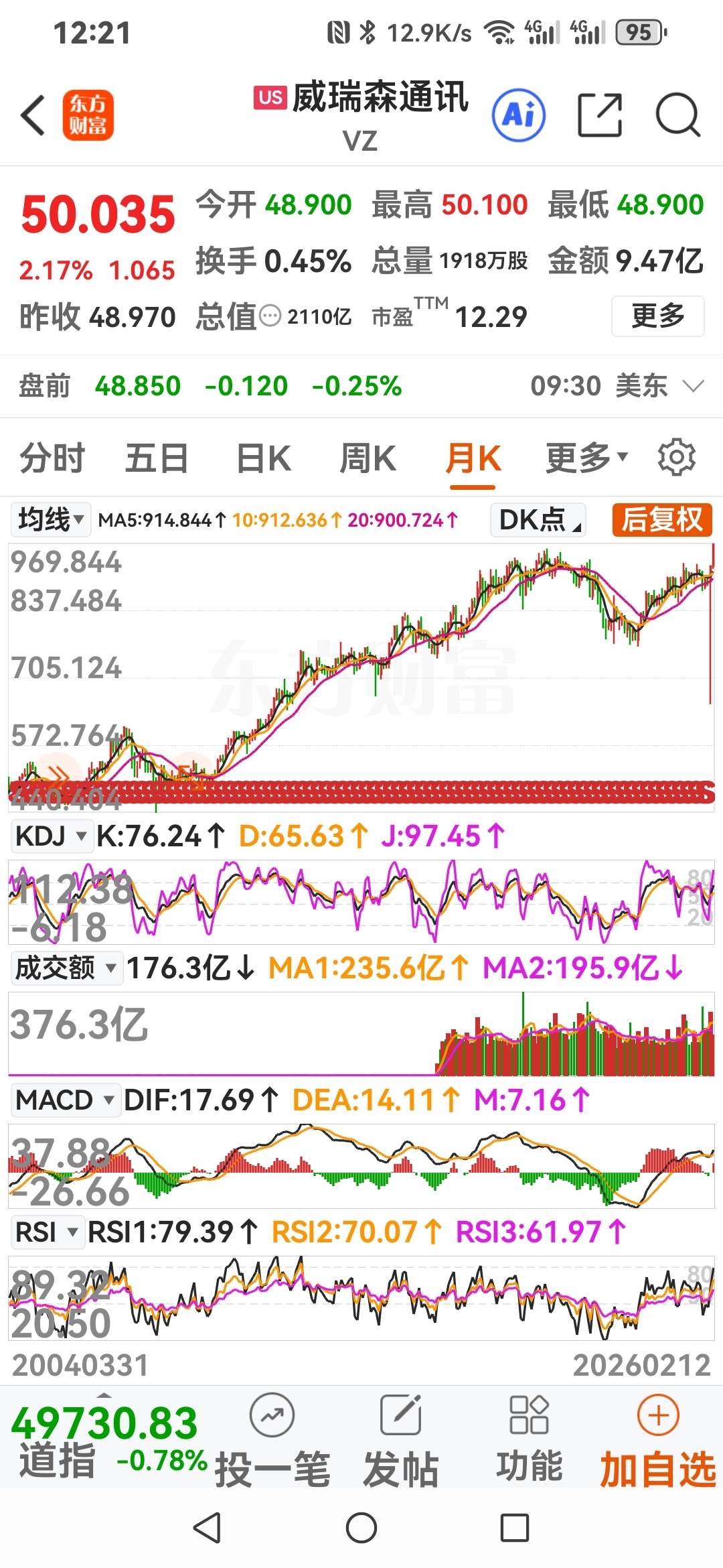 美股通讯电信股威瑞森继续上涨,复权后股价创历史新高。中国移动遥不可及,我们15亿