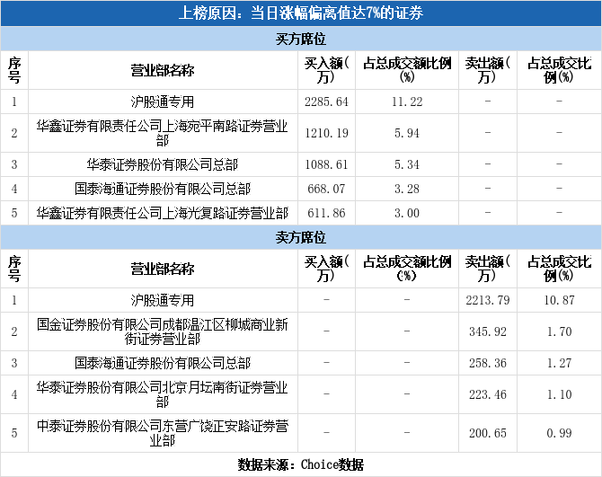 沪股通现身龙虎榜,维远股份涨停(11-26)
