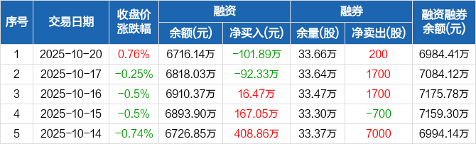 新天绿能:融资净偿还101.89万元,融资余额6716.14万元(10-20)