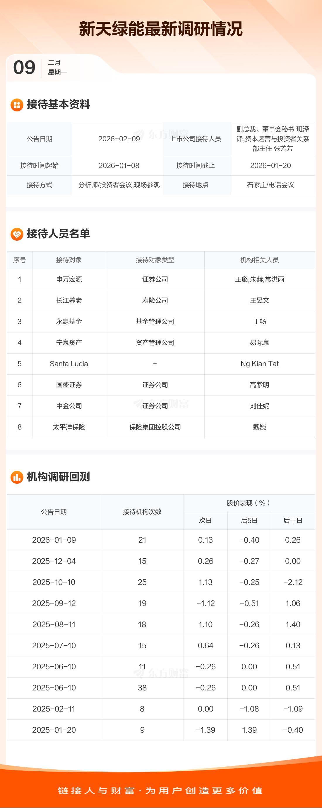 新天绿能2月9日公告称,1月8日至1月20日接待申万宏源等8家机构调研。接待人员包括副总裁、董事会秘书 班泽锋,资本运营与投资者关系部主任 张芳芳。