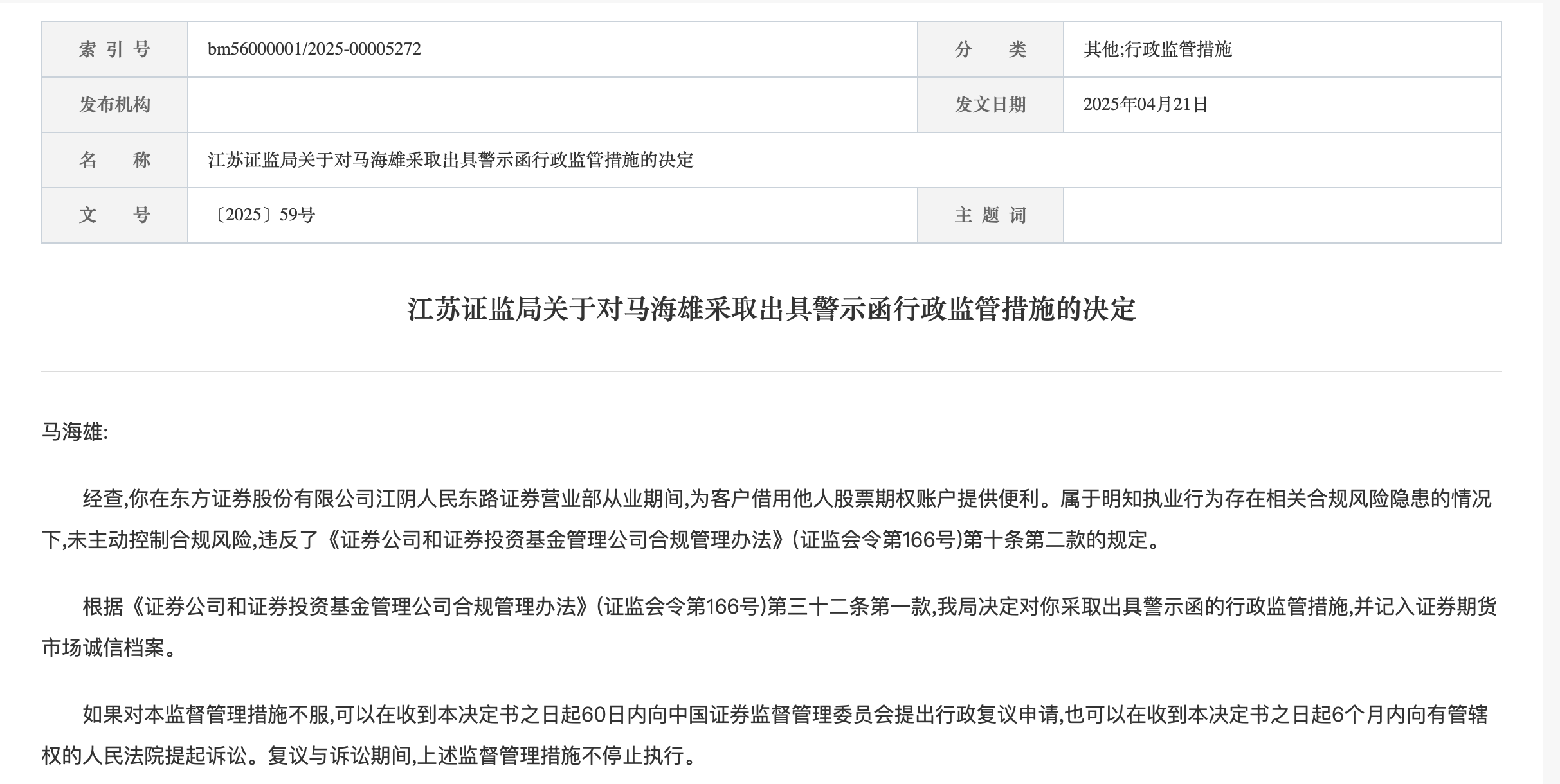 类似地,2025年4月21日,江苏证监局对东方证券江阴人民东路证券营业部从业人员马海雄出具警示函,其在为该营业部从业期间,为客户借用他人股票期权账户提供便利。