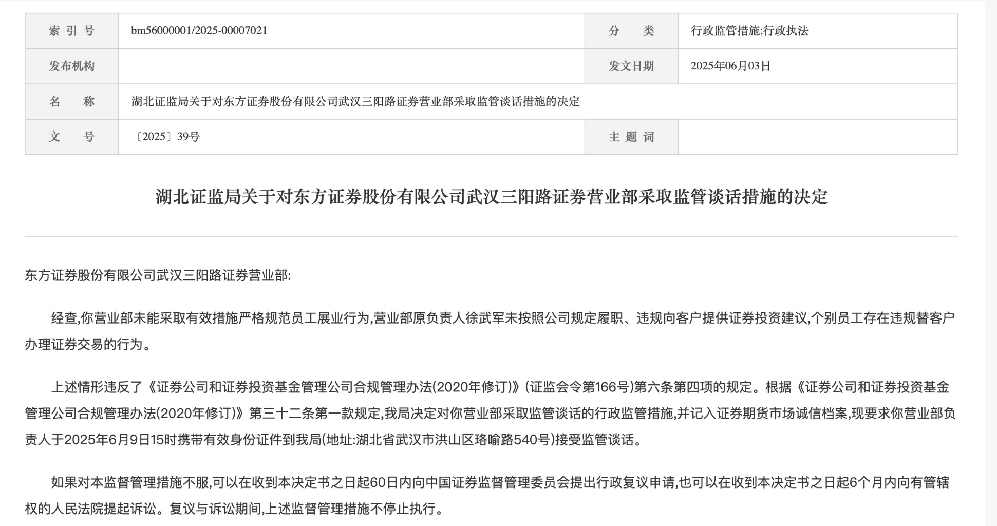 2025年6月3日,湖北证监局对东方证券武汉三阳路证券营业部采取监管谈话的行政监管措施。经调查,该营业部未能采取有效措施严格规范员工展业行为,营业部原负责人徐武军未按照公司规定履职、违规向客户提供证券投资建议,个别员工存在违规替客户办理证券交易的行为。