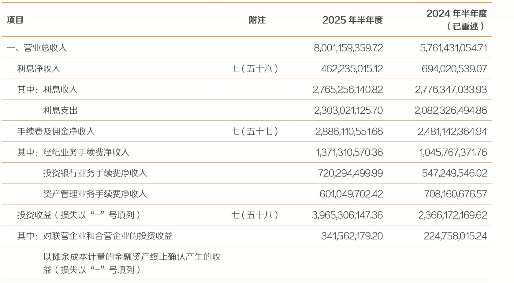 2025年上半年,公司实现营业收入80.01亿元,同比增长38.8%;归母净利润34.63亿元,同比大幅增长64.02%。更引人注目的是,其投行业务手续费净收入2025年上半年达7.20亿元,同比增长31.62%。其中,股权承销规模大幅提升,Wind数据显示,2025年上半年公司完成股权融资10单,发行数量位居行业第6;债券承销总规模2779.48亿元,同比增长28%,市场排名第9。