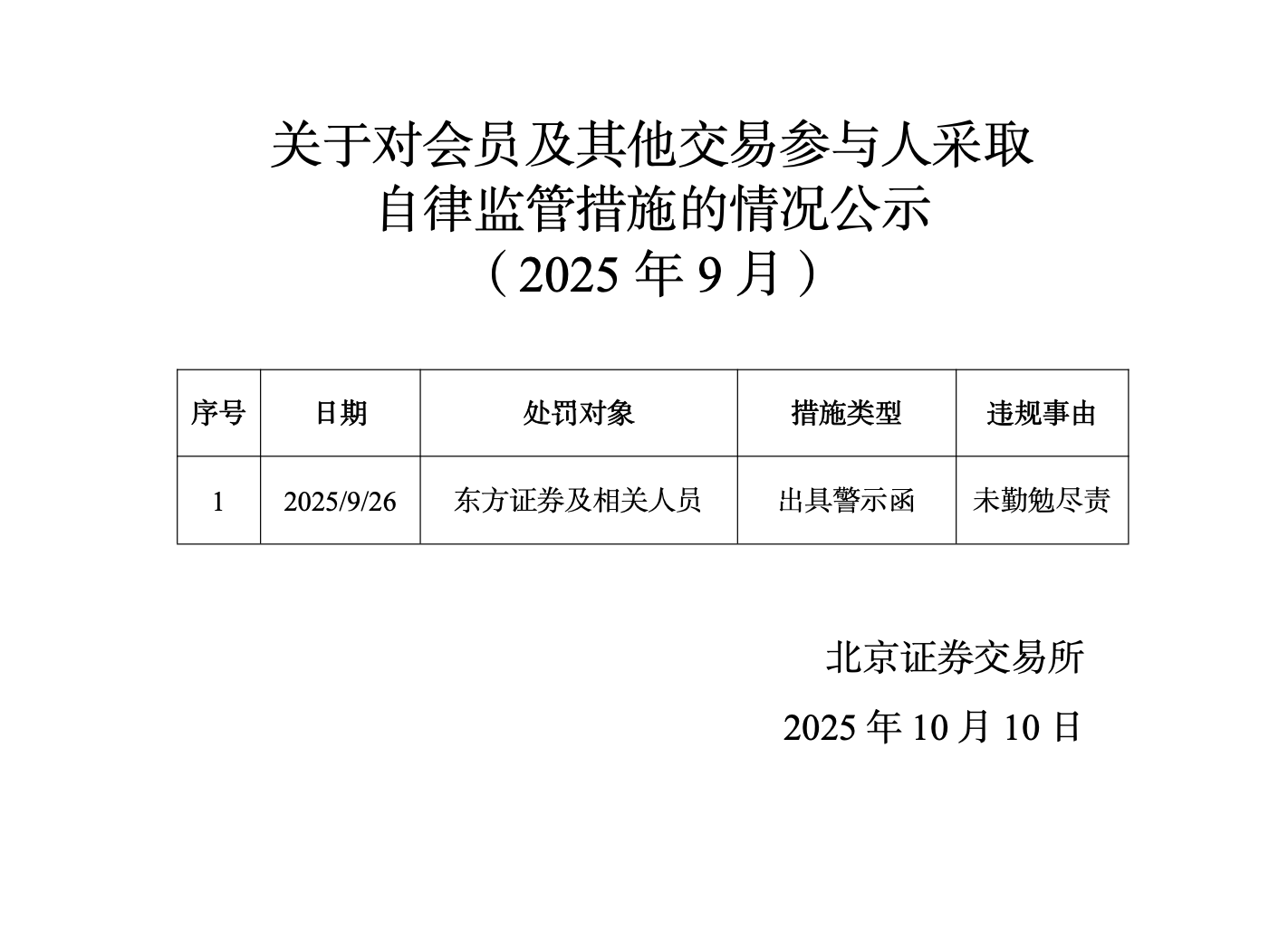 10月10日,北交所官网公布了一则“关于对会员及其他交易参与人采取自律监管措施的情况公示”,显示2025年9月,北交所对东方证券(600958)及相关人员出具警示函,这已是该券商投行业务今年至少第三次被监管机构采取自律监管措施。