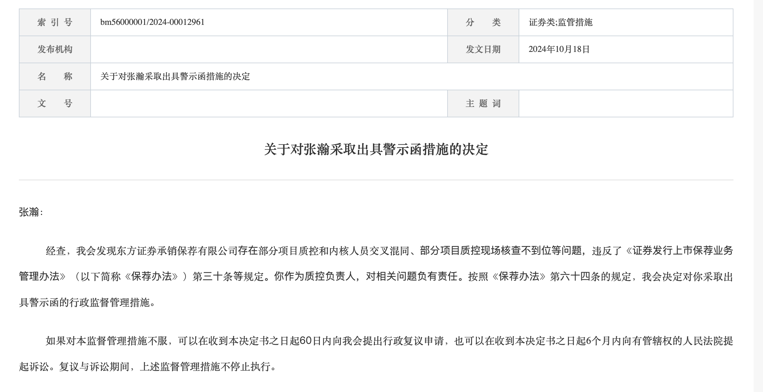 而早在2024年5月31日,中国证监会曾对东方证券承销保荐有限公司质控负责人张瀚出具警示函,其中提到:东方证券承销保荐有限公司存在部分项目质控和内核人员交叉混同、部分项目质控现场核查不到位等问题。