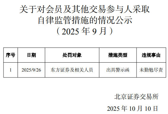 10月10日,北交所官网发布了2025年9月对会员及其他交易参与人采取自律监管措施的情况公示。