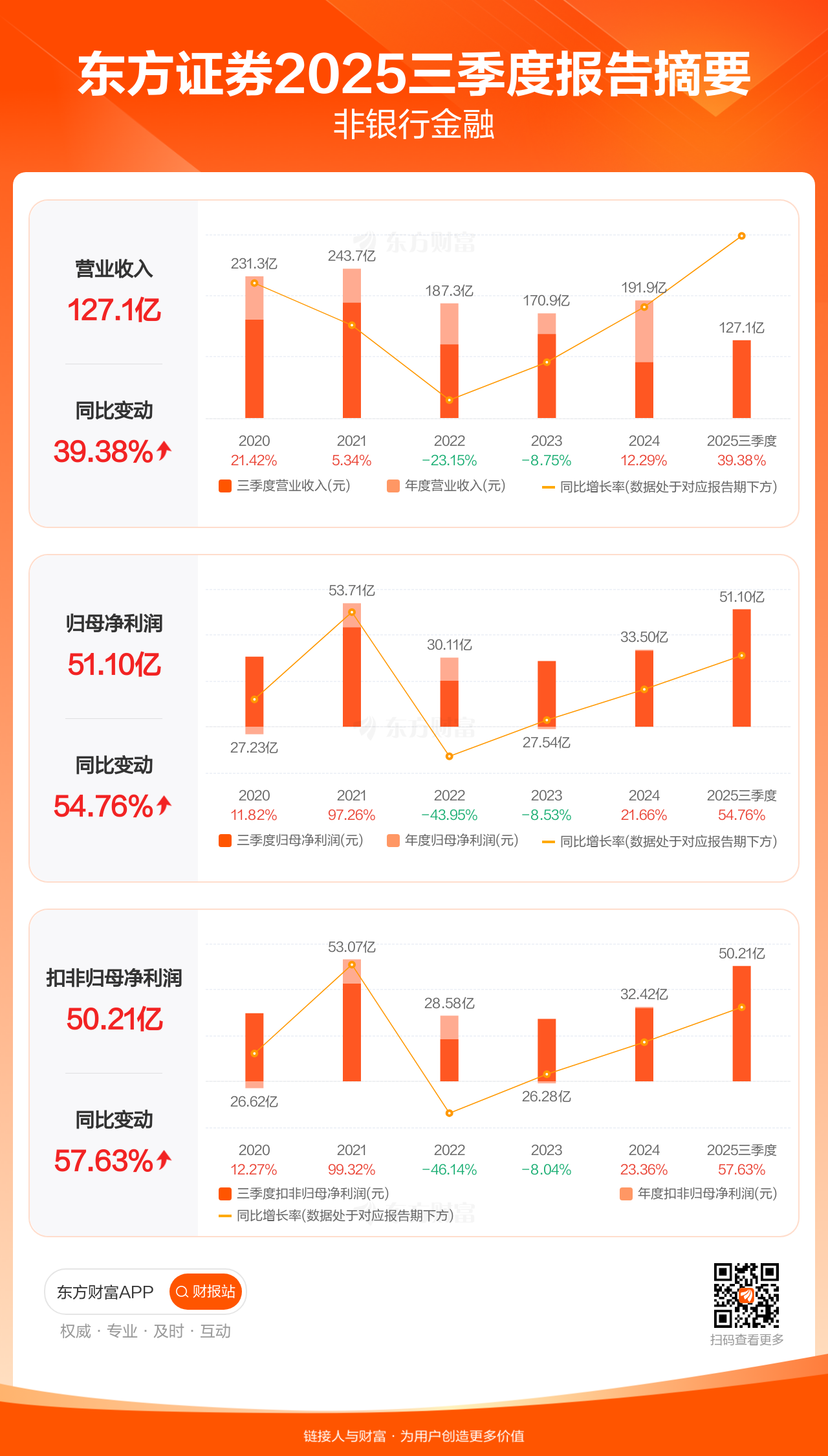 东方证券10月31日发布2025年三季报显示,公司前三季实现营业收入127.08亿元,同比增长39.38%;归母净利润51.10亿元,同比增长54.76%;扣非归母净利润50.21亿元,同比增长57.63%。