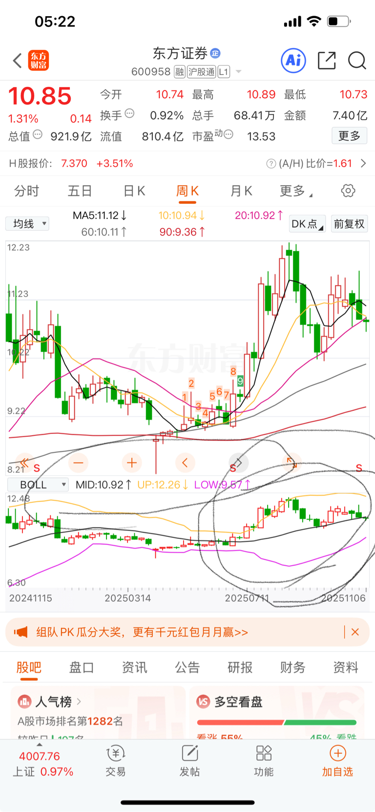 $东方证券(SH600958)$ 9.5到12.2之间布林线