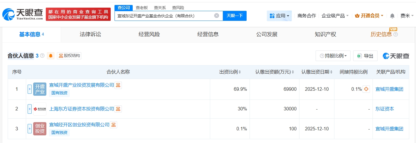 每经AI快讯,天眼查工商信息显示,近日,宣城东证开盛产业基金合伙企业(有限合伙)成立,执行事务合伙人为上海东方证券资本投资有限公司,出资额10亿元人民币,经营范围为以私募基金从事股权投资、投资管理、资产管理等活动,财务咨询,以自有资金从事投资活动。合伙人信息显示,该基金由宣城开盛产业投资发展有限公司、上海东方证券资本投资有限公司、宣城经开区创业投资有限公司共同出资。