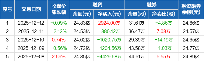 东方证券:融资净买入2924万元,融资余额24.83亿元(12-12)