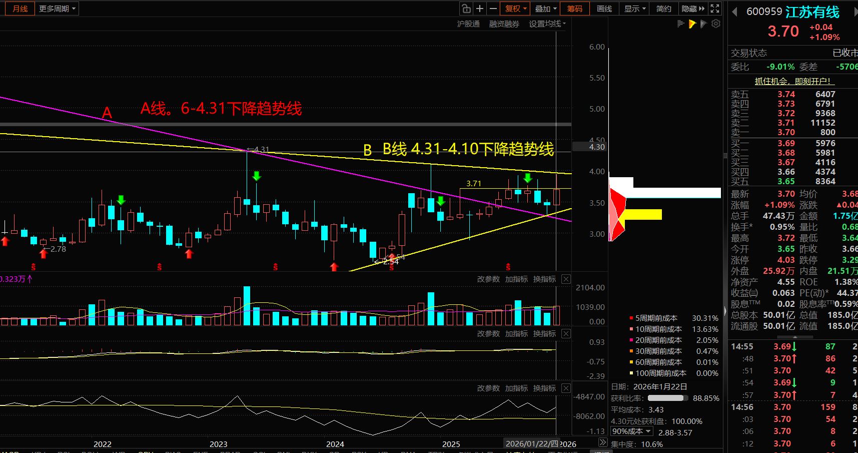 到1月30日周五,还有六个交易日,看看月线到底收在那个价位上。看东方财富的筹码分布数据。有点意思。筹码集中度已经到10.6%了。盈利比率88.85. 90%成本在2.88-3.57.