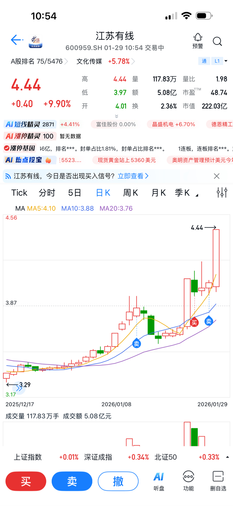 $江苏有线(SH600959)$ 交易纯粹是和自己博弈,觉得这个票子冲高卖出,想回踩继续买回来,结果没有到自己位置,可是这个票子看起来要启动了,那该怎么办?我只能追了,但追的的票子心里有点不甘心,结果卖出后涨停,这个剧本我会笑很久,哈哈哈