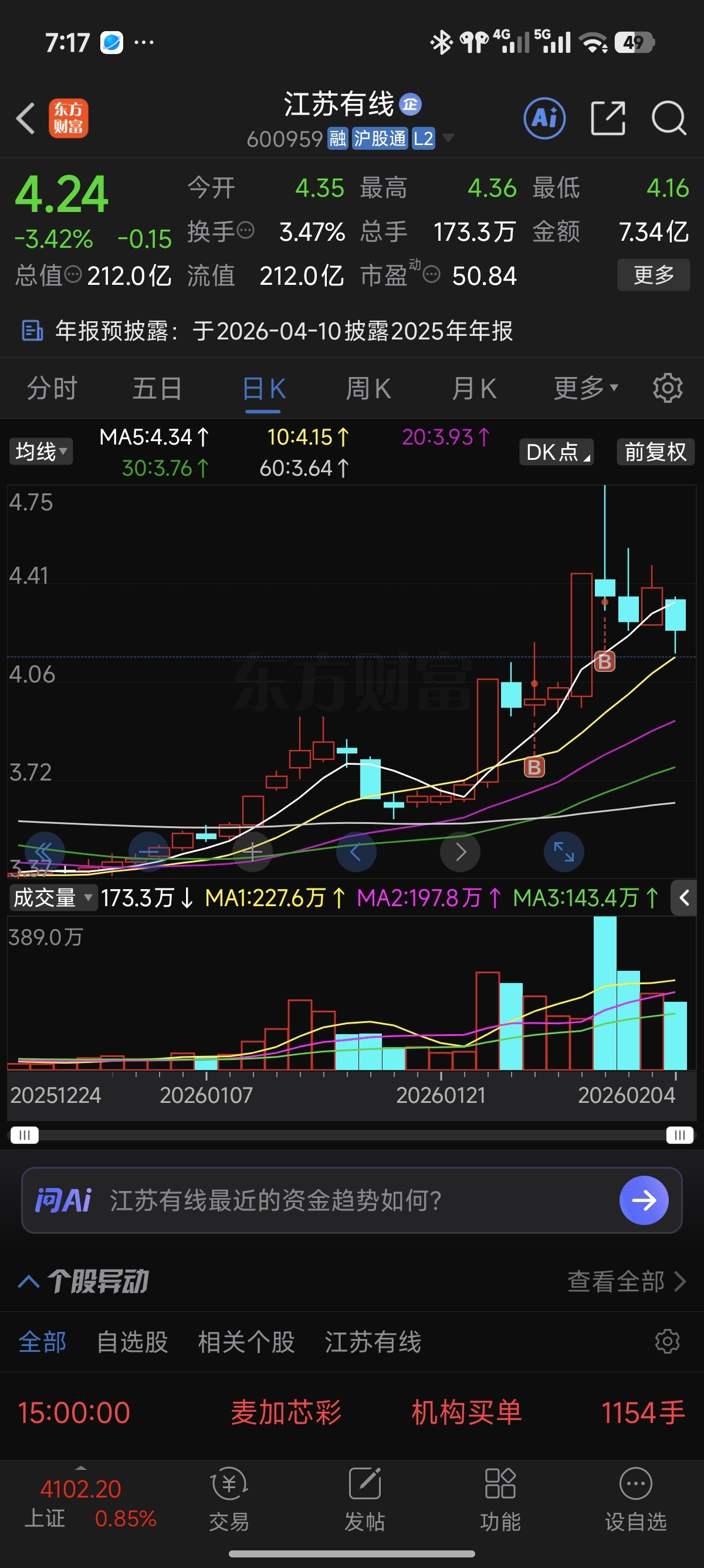 $江苏有线(SH600959)$ 果然浮盈加仓一把亏光