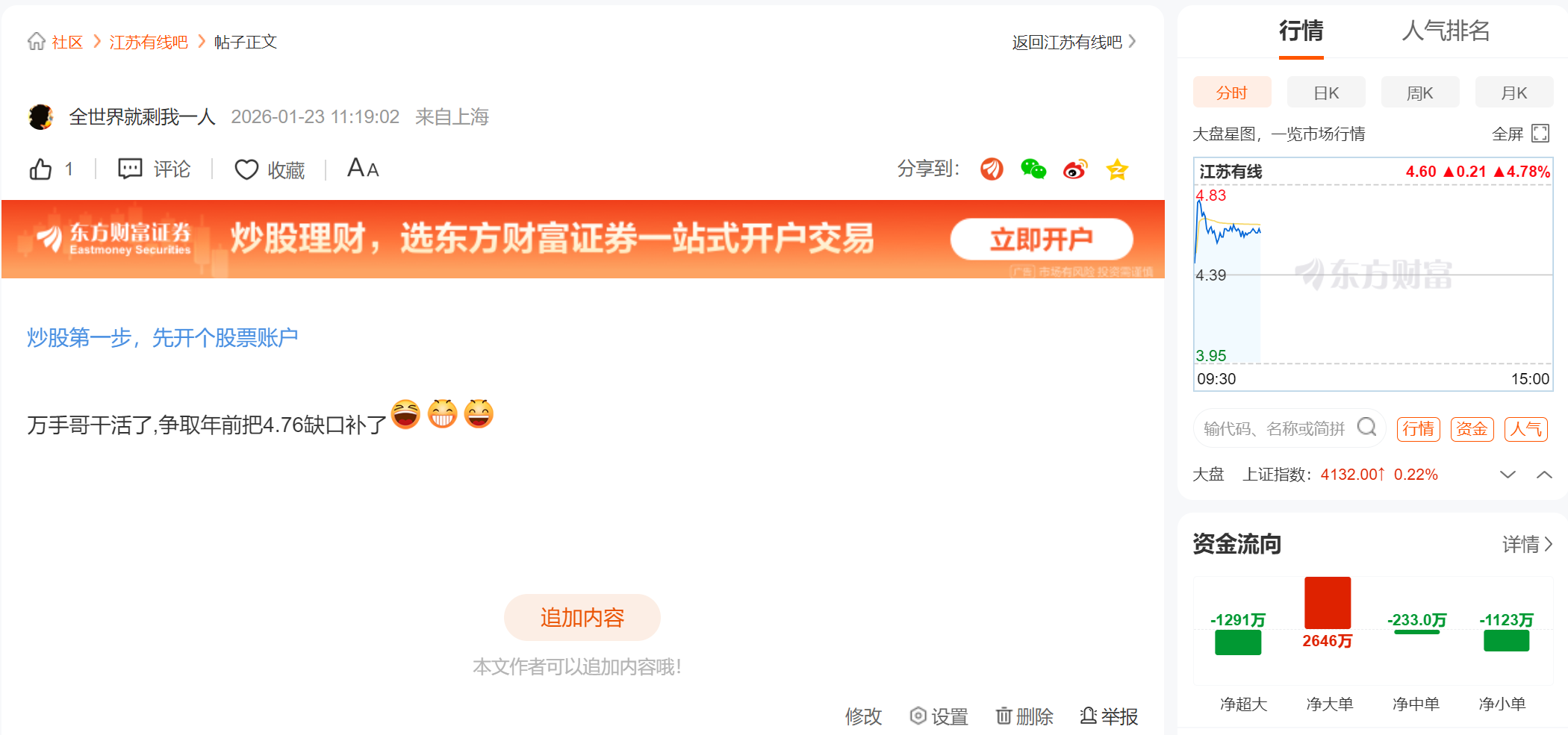 温馨提示: 1.根据《证券法》规定,禁止编造、传播虚假信息或者误导性信息,扰乱证券市场;2.用户在本社区发表的所有资料、言论等仅代表个人观点,与本网站立场无关,不对您构成任何投资建议。用户应基于自己的独立判断,自行决定证券投资并承担相应风险。《东方财富社区管理规定》